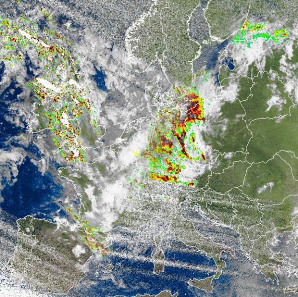 Auf dem Satellitenfoto von heute Morgen sind die oft sehr kompakten Wolken, die sich von den Alpen bis in die Westhälfte Polens hinein erstrecken. Hierbei fiel verbreitet langanhaltender und ergiebiger Regen, zudem bildeten sich vielerorts, teils kräftige Gewitter.