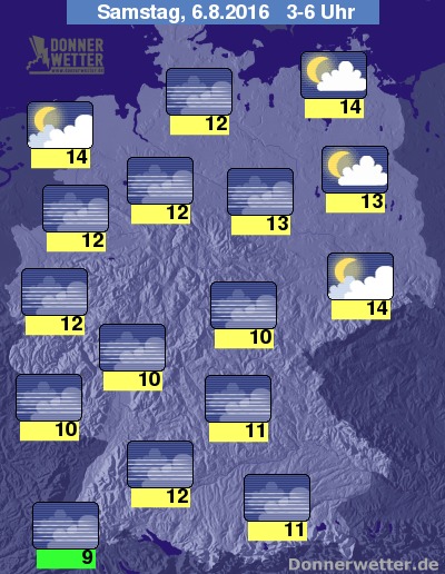 In der Nacht zum Samstag ist es in den östlichsten Landesteilen anfangs noch oft stark bewölkt, jedoch bereits weitgehend trocken, hier lockert der Himmel erst im Laufe der zweiten Nachthälfte nach und nach auf. Im übrigen Bundesgebiet ist der Himmel verbreitet locker bewölkt oder sternenklar und es bleibt dabei trocken. Im Nordseeumfeld sind allerdings oft auch dichtere Wolken und einzelne Schauer möglich. Die Temperatur sinkt auf 14 Grad in Dresden und bis etwa 9 Grad am Bodensee.