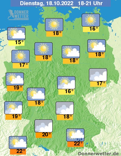 Heute Abend halten sich über dem Süden und über Sachsen noch oft dichtere Wolken, lediglich an den Alpen sind dazu letzte Schauer möglich. Im großen Rest des Landes bleibt es überall trocken und die Sonne kann vielerorts ungestört scheinen. Die Temperatur liegt bei 15 Grad in Cuxhaven und bis 22 Grad in München.