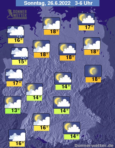 In der Nacht zum Sonntag bringen dichte Wolken vom Mittel- bis zum Niederrhein gebietsweise Schauer, in der übrigen Westhälfte ist es meist aufgelockert, teils auch stärker bewölkt, aber weitgehend trocken. Weiter nach Osten hin ist der Himmel meist nur locker bewölkt, teils auch sternenklar, dazu bleibt es trocken. Die Temperatur sinkt auf 18 Grad in Berlin und etwa 13 Grad in Saarbrücken.