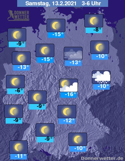 In der folgenden Nacht zeigt sich der Himmel über Deutschland überwiegend sternenklar. Lediglich über Sachsen ist es überwiegend stark bewölkt und gebietsweise fällt hier auch Schnee. Über Thüringen sind ebenfalls hier und da dichte Wolken möglich, Schnee fällt jedoch kaum. Im übrigen Bundesgebiet bleibt es trocken bei Tiefstwerten von -6 Grad in der Kölner Bucht und bis -16 Grad im Thüringer Becken.