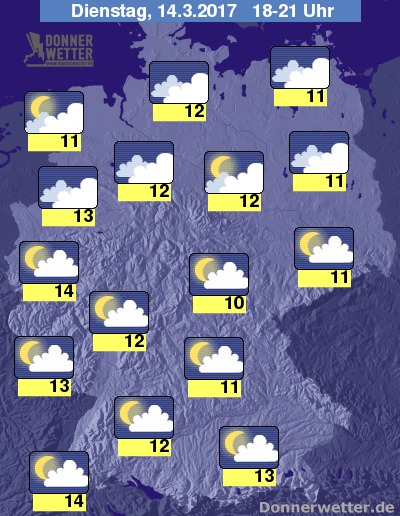 Heute Abend ziehen über die Südhälfte Deutschlands meist nur lockere Wolkenfelder hinweg. Zahlreicher und teils auch dichter sind die Wolken hingegen über Norddeutschland, gebietsweise zeigen sich aber auch hier Auflockerungen, dazu bleibt es trocken. Die Temperatur liegt bei 10 Grad im Grabfeld und bis 14 Grad in Freiburg.