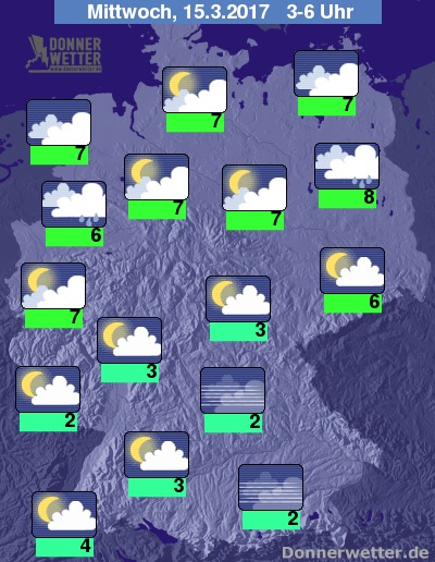 In der Nacht zum Mittwoch zieht ein schwacher Ausläufer des Tiefs über Nordosteuropa in den Norden und nördlichen Osten Deutschlands, hier ist bei dichten Wolken dann etwas Regen möglich. Im großen Rest des Landes bleibt es unter Hochdruckeinfluss jedoch trocken und meist auch nur leicht bewölkt, vor allem im Süden oft sternenklar. Die Temperatur sinkt auf 8 Grad in Berlin und bis 2 Grad in der Hallertau.