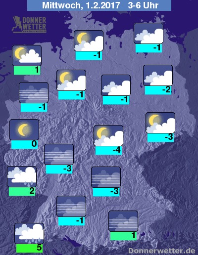 In der Nacht zum Mittwoch ist es am Alpenrand noch meist bedeckt und es fällt hier gebietsweise Regen, zum Teil auch Schneeregen, dabei ist mit möglicher Glätte zu rechnen! Weiter nach Norden hin ist es häufig locker oder aufgelockert bewölkt, nicht selten auch sternenklar. Mehr und dichtere Wolken halten sich über dem Osten Deutschlands, jedoch bleibt es auch hier trocken. Die Temperatur sinkt auf 5 Grad in Freiburg und bis -4 Grad im Grabfeld.