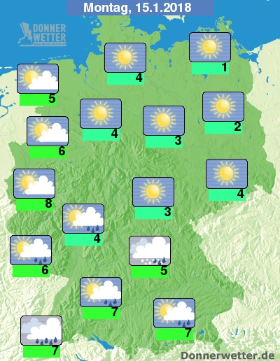 Am Montag scheint nach örtlicher Nebelauflösung noch verbreitet die Sonne. Im Südwesten ziehen aus Südwesten jedoch bereits vormittags mehr und dichterwerdende Wolken auf, die am Nachmittag im Süden und Südwesten auch gebietsweise Regen bringen, sonst bleibt es noch trocken. Die Temperatur steigt auf 1 Grad in Stralsund und bis 8 Grad in Köln.