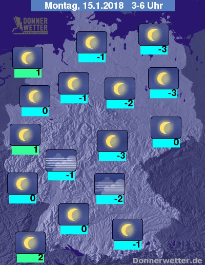 In der Nacht zum Montag zeigt sich der Himmel verbreitet sternenklar, dazu bleibt es trocken. Die Temperatur sinkt auf 2 Grad im Oberrheingraben und bis -3 Grad an der Oder. Stellenweise bildet sich Nebel oder Hochnebel.