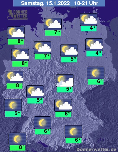 Heute Abend zeigt sich der Himmel über Süddeutschland und über Sachsen weitgehend sternenklar. Im übrigen Bundesgebiet ist es meist gering bis wechselnd, hier und da auch stärker bewölkt. Es bleibt trocken bei 4 Grad an der Oder und bis 8 Grad an der Ems.