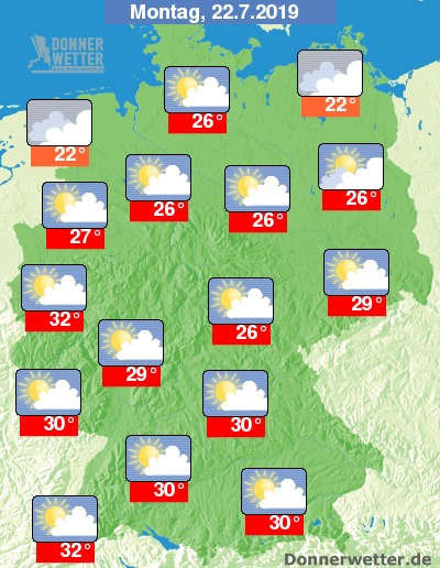 Am Montag ist es häufig heiter oder sonnig, allerdings ziehen über den Norden und Osten auch gebietsweise viele und zum Teil dichte Wolken hinweg, dabei bleibt es aber trocken. Die Temperatur steigt auf rund 22 Grad an den Küsten und bis 32 Grad entlang von Ober- und Mittelrhein.