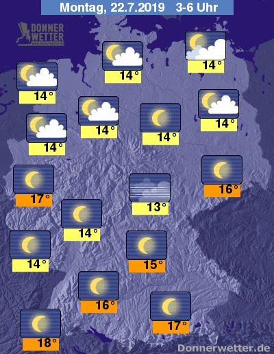 In der kommenden Nacht klingen letzte Schauer an den Alpen rasch ab, anschließend lockert und klart der Himmel hier, wie schon im übrigen Land, verbreitet auf. Im Norden ziehen jedoch auch gebietsweise einige, teils auch dichtere Wolken durch, dazu bleibt es trocken. Die Temperatur sinkt auf 18 Grad im Breisgau und bis 13 Grad am Thüringer Wald.