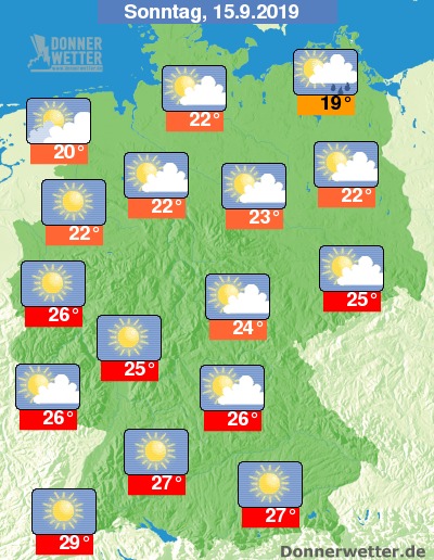 Am Sonntag ist es über dem Norden oft stark, teils aufgelockert bewölkt, dabei ist nur ganz vereinzelt etwas Regen möglich. Im übrigen Bundesgebiet ist es verbreitet heiter bis sonnig, dabei bleibt es landesweit trocken. Die Temperatur erreicht 19 Grad an der Müritz und bis zu 29 Grad im Oberrheingraben.