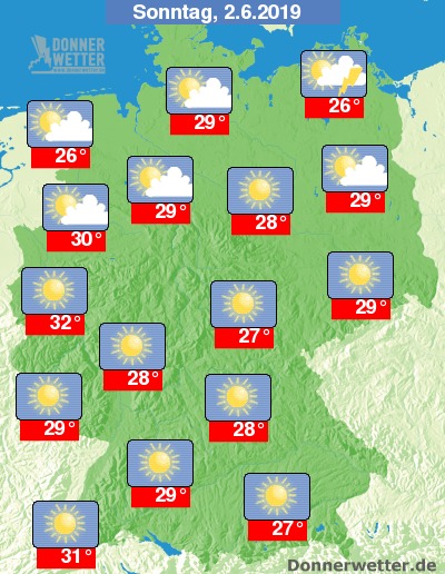 Am Sonntag erwartet uns wieder verbreitet heiteres bis sonniges und dabei trockenes Sommerwetter. Lediglich im Ostseeumfeld können sich ganz vereinzelt Schauer oder Gewitter bilden. Die Temperatur steigt auf 26 Grad in Rostock und bis 32 Grad in Köln.