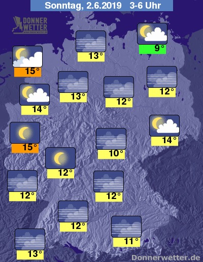 In der kommenden Nacht klingen letzte Schauer und Gewitter im Südosten rasch ab und der Himmel klart auch hier, wie schon in der übrigen Republik verbreitet auf. Im Norden und vor allem an den Küsten können allerdings auch einige Wolken durchziehen. Es bleibt landesweit trocken bei Tiefstwerten von 15 Grad am Niederrhein und bis 9 Grad in Vorpommern.