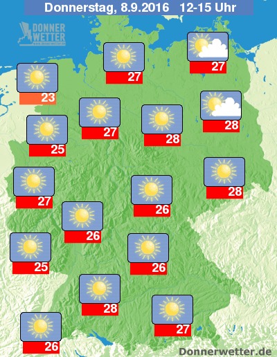Heute Nachmittag scheint über der Bundesrepublik verbreitet die Sonne, dabei sind nur hier und da wenige Wolken möglich, einige lockere Wolken können über den Nordosten des Landes hinwegziehen. Es bleibt überall trocken bei Werten zwischen 23 Grad an der Nordsee und um 28 Grad in Dresden.