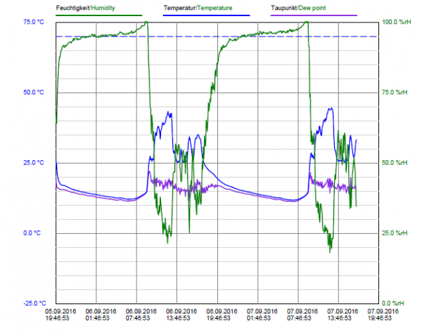 Schwitzen und frösteln liegen in diesen Tagen ganz nah beieinander. Die folgende Grafik zeigt den Feuchtigkeit-, Temperatur- und Taupunktverlauf zwischen dem 05.09. (19:46 Uhr) und dem 07.09. (19:46 Uhr) an unserer Wetterstation in Bonn. Gut zu erkennen sind vor allem die hohen Temperaturabweichungen in diesem Zeitraum.