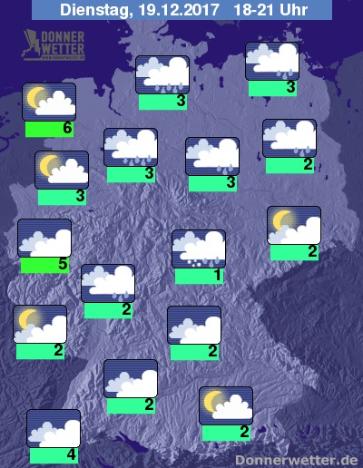 Heute Abend breitet sich die dichten Wolken und der Regen, in Thüringen und Nordbayern auch Schneeregen, bis etwas zur Mainlinie hin aus. Südlich davon ist es noch oft aufgelockert, teils auch schon stark bewölkt, aber noch trocken. Trocken und zum Teil aufgelockert bleibt es auch westlich von Rhein und Ems. Die Temperatur liegt bei 1 bis 6 Grad.