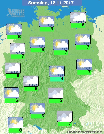 Am Samstag überquert ein Ausläufer das Land von Norden nach Süden und es fällt dazu zeitweise Regen, Schneeregen und zum Teil auch Schnee oder Graupel. Im Süden bleibt es bei wechselnder bis starker Bewölkung bis zum Abend noch trocken. Die Temperatur erreicht 4 Grad im Thüringer Becken und bis 8 Grad im Rheinland. Im Norden weht ein teils starker an den Küsten von Nord- und Ostsee auch ein stürmischer Wind.