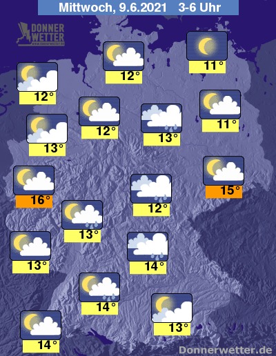 Die Temperaturen sinken in den frühen Morgenstunden auf Werte um 16 Grad in der Kölner Bucht und um 12 Grad in Nordmecklenburg.