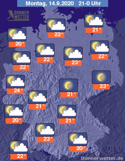 Die Temperaturen sinken am späten Abend auf Werte um 24 Grad im Rheinland und um 20 Grad an der Nordseeküste sowie am Alpenrand.
