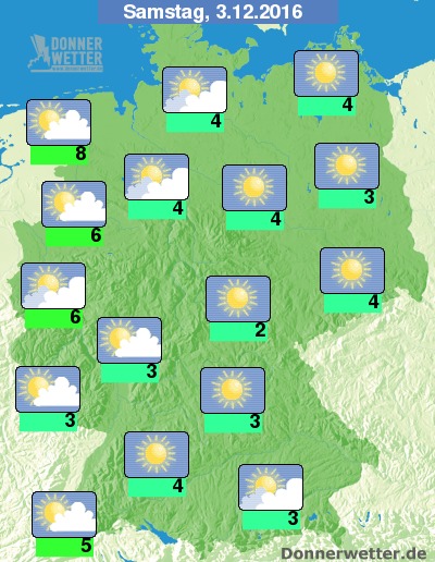 Heute scheint über weiten Landesteilen die Sonne von einem teils leicht bewölktem und sonst oft auch wolkenlosem Himmel. Gebietsweise mehr, jedoch weitgehend aufgelockerte Wolken ziehen über den Norden und den Alpenrand hinweg. Es bleibt landesweit trocken. Die Temperatur erreicht Werte zwischen 2 und 8 Grad.