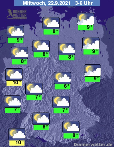 In der folgenden Nacht ist es häufig locker bis aufgelockert, hier und da auch stärker bewölkt oder neblig-trüb, dazu bleibt es trocken. Die Temperatur sinkt auf 10 Grad am Ober- und Mittelrhein und bis 6 Grad im Vogtland.