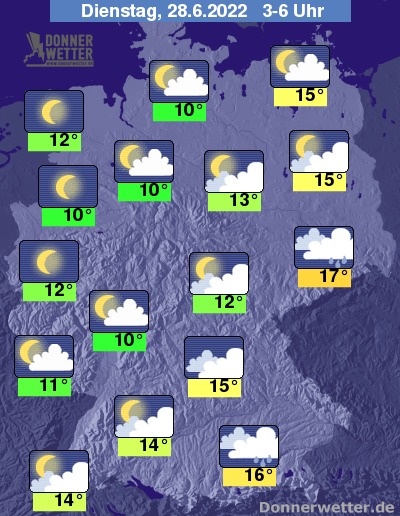 Am Dienstag bleibt es über dem Süden stark, über Sachsen oft stark bewölkt, dabei bleibt es aber zumeist trocken. In Alpennähe ist jedoch mit einzelnen Schauern und Gewittern zu rechnen. Im übrigen Land ist es verbreitet heiter bis sonnig und trocken. Die Temperatur steigt auf 20 Grad an der Nordsee und bis 28 Grad in der Kölner Bucht.