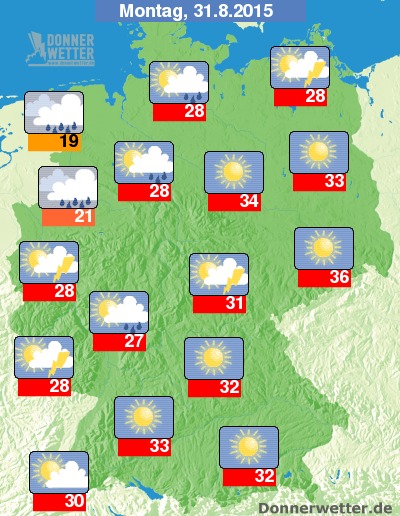 Zum Start in die neue Wetterwoche zeigt sich das Wetter zunächst verbreitet sehr freundlich und trocken mit nur lockeren Wolken, im Nordwesten können jedoch schon zu Beginn oft dichte Wolken durchziehen, die für einzelne Schauer und Gewitter sorgen können. Im Tagesverlauf nimmt die Bewölkung im Westen und Norden weiter zu und nachfolgend sind auch hier Schauer und Gewitter möglich. Im übrigen Bundesgebiet bleibt es dagegen weitgehend sonnig, teils auch heiter und dazu trocken. Die Temperatur steigt auf teils nur kühle 19 Grad an der Nordsee und bis auf heiße 36 Grad in Dresden.