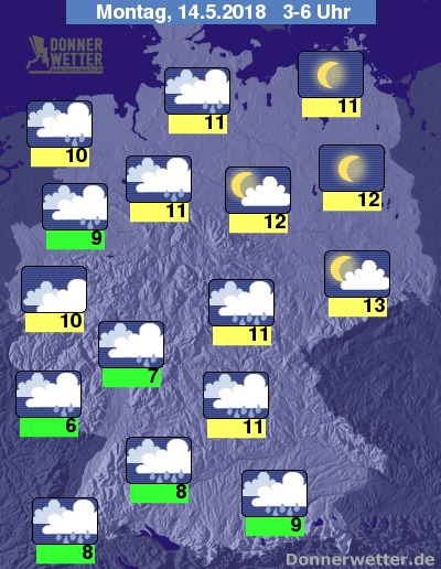In der folgenden Nacht ist der Himmel über dem Nordosten und Osten Deutschlands meist sternenklar. Im großen Rest der Republik ist es hingegen bedeckt und es fällt zeitweise Regen. Die Temperatur sinkt auf 13 Grad in Dresden und bis 6 Grad im Saargau.