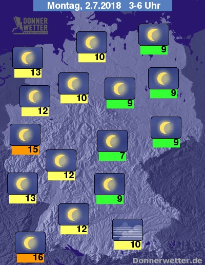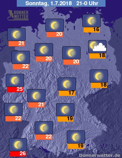 Höchstwerte teils noch um 25 Grad C in den späten Abendstunden.