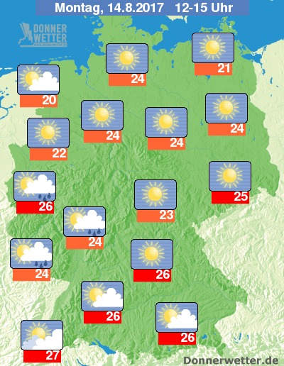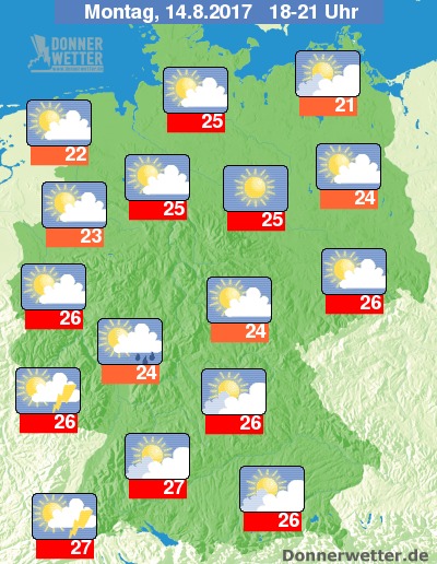 Heute Abend können sich im Südwesten noch einzelne Schauer oder Gewitter entwickeln, auch sonst ist es im Süden und Westen teils heiter, teils auch mal stärker bewölkt, jedoch trocken. Weiter nach Norden und Osten bleibt es verbreitet heiter und dazu trocken. Die Temperatur liegt bei 21 Grad in Rostock und bis 27 Grad im Breisgau.