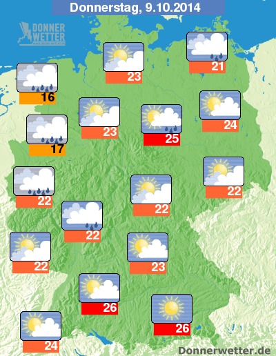 Der heutige Tag zeigt sich besonders im Norden und Westen vielfach trüb und nass, gebietsweise fällt kräftiger Regen und vor allem am Vormittag weht noch verbreitet frischer und teils auch starker Wind. Besonders im Süden ist es häufig nur locker bewölkt und es bleibt trocken, aber auch im Osten ist es bei aufgelockerter Bewölkung meist trocken. Die Temperatur steigt auf 16 Grad in Ostfriesland und mit Föhnwirkung bis 26 Grad am Alpenrand.