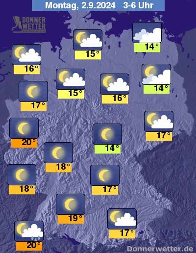 In der Nacht zum Montag ist der Himmel über dem Südwesten und am Alpenrand meist wechselnd bewölkt und es muss mit lokalen Schauern und Gewittern gerechnet werden. In den übrigen Landesteilen ist es sternenklar oder nur gering bewölkt und es bleibt meist niederschlagsfrei.