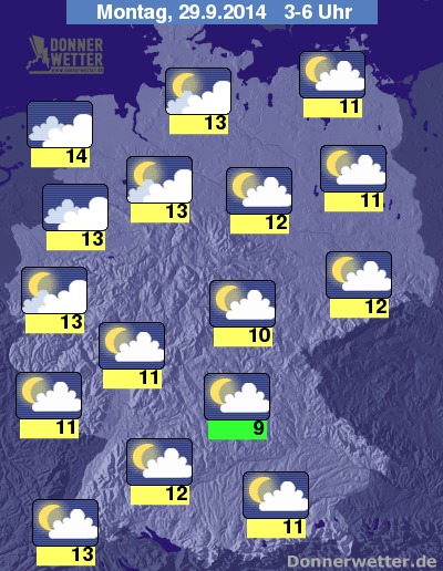 In der kommenden Nacht bleibt die Bewölkung im Norden gebietsweise dicht, sonst zieht dagegen verbreitet aufgelockerte Bewölkung durch, dabei bleibt es trocken. Die Temperatur sinkt auf 14 Grad an der Ems und bis auf ebenfalls milde 9 Grad in Franken.