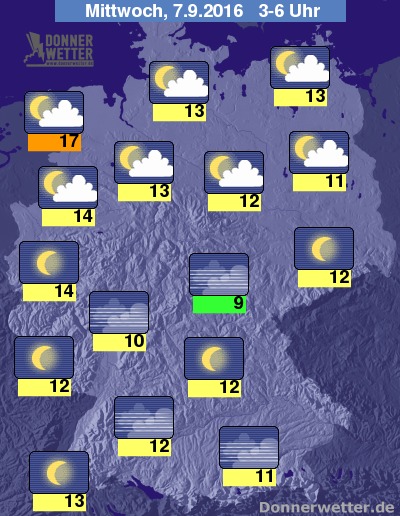 In der folgenden Nacht zeigt sich der Himmel von der breiten Mitte Deutschlands bis in den Süden sternenklar. Im Norden ziehen hingegen auch oft lockere Wolken durch, die jedoch keinen Regen bringen. Die Temperatur sinkt auf 17 Grad in Emden und bis 9 Grad im Grabfeld.