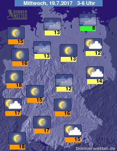 In der Nacht zum Mittwoch sind im Süden anfangs noch vereinzelt Schauer oder Gewitter möglich, sonst ist der Himmel hingegen überwiegend nur locker bewölkt oder sternenklar und es bleibt trocken. Die Temperatur sinkt auf milde 18 Grad in Köln und bis 8 Grad an der Müritz.