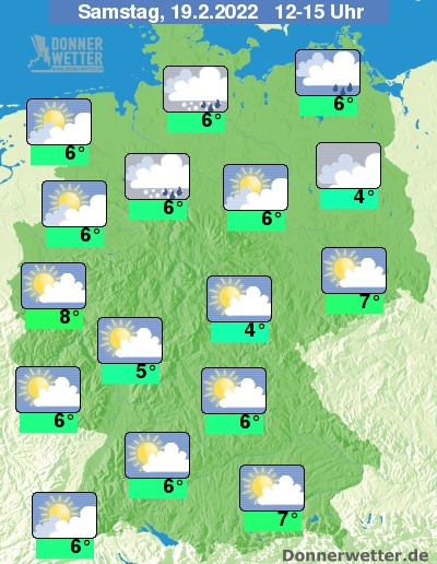 Heute Nachmittag ist es vor allem im Süden und Osten oft heiter. Im Norden und im Verlauf auch im Westen ziehen zunehmend dichte Wolken auf, allerdings bleibt es hier zum Großteil trocken, hier und da kann jedoch auch Regen, Schneeregen oder Schnee fallen. Über der Nordosthälfte herrscht zum Teil Sturm, an den Küsten herrscht sogar oft schwerer Sturm. Die Temperatur liegt bei 4 Grad in Erfurt und bis 8 Grad in Köln.