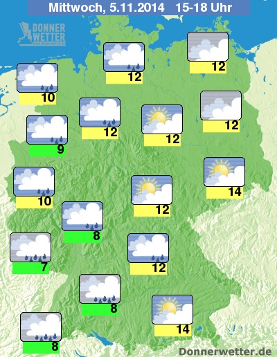 Heute Nachmittag bleibt die Wolkendecke vor allem über der Westhälfte des Landes weitgehend geschlossen und es fällt immer wieder, im Südwesten teils ergiebiger Regen, nach Osten hin sind hier und da auch Auflockerungen möglich, dazu bleibt es hier weitgehend trocken. Die Temperatur liegt bei teils nur 7 Grad am Pfälzer Wald und bis 14 Grad im Raum München.