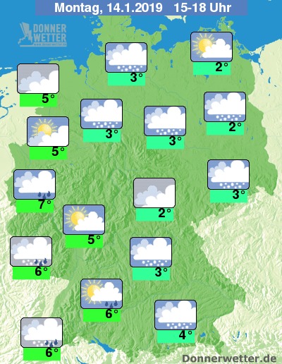 In den Mittags- und frühen Nachmittagsstunden bleibt der Himmel über weiten Teilen des Landes bedeckt, einzelne Auflockerungen sind entlang der Oder sowie regional am Niederrhein und Thüringen möglich. Im Südwesten fällt dabei zeitweise Schneeregen, Regen oder Graupel, entlang der Weser sowie in Bayern gehen die Niederschläge meist als Schnee nieder.