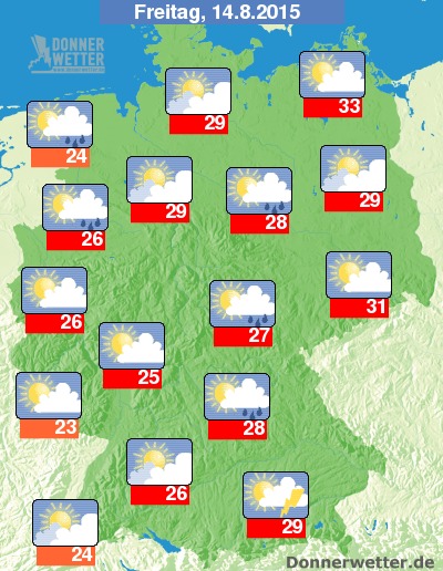 Am Freitag muss bereits in den mittleren und nördlichen Landesteilen mit Schauern gerechnet werden. Auf hohem Niveau bewegen sich die Temperaturen: Höchstwerte um 23 Grad im Saarland und um 31 Grad C in Sachsen.