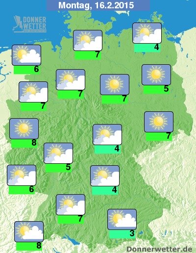 Am heutigen Rosenmontag zeigt sich Petrus den Karnevalsjecken gegenüber von seiner freundlicheren Seite, denn es bleibt überall trocken. Vor allem im Osten des Landes scheint die Sonne dabei von einem meist wolkenlosen Himmel, aber auch sonst kann sich abseits einiger, zum Teil jedoch zäher Nebel- oder Hochnebelfelder doch häufiger die Sonne zeigen. Die Temperatur steigt auf 3 Grad in München und bis etwa 8 Grad im Rheinland.
