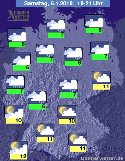 Heute Nachmittag zeigt sich besonders im Süden häufig die Sonne zwischen oft nur lockeren Wolken, jedoch ist es auch im Osten oft aufgelockert bewölkt, dazu bleibt es hier trocken. Im übrigen Bundesgebiet hält sich zumeist dichte Bewölkung aus der im Südwesten und Westen des Landes gebietsweise Regen fällt, sonst bleibt es aber trocken. Die Temperatur liegt bei 6 bis 12 Grad.