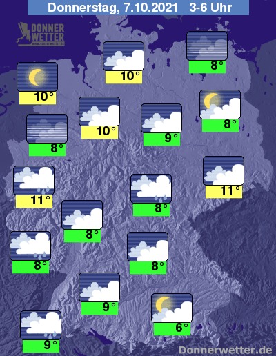 In der Nacht zum Donnerstag fällt über der Südhälfte Deutschlands hier und da noch Regen, dabei bleibt die Wolkendecke weitgehend geschlossen. Dagegen lockert und klart der Himmel im Norden und im weiteren Verlauf über der Nordhälfte verbreitet auf, hier bleibt es trocken. Stellenweise kann sich Nebel bilden. Die Temperatur sinkt auf 11 Grad in Köln und bis 6 Grad in Augsburg.