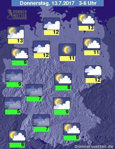 In der folgenden Nacht fällt im Osten des Landes häufig noch zeitweiliger Regen, sonst ist es über dem Norden und Nordosten teils leicht, teils aber auch stark bewölkt, dazu jedoch meist trocken. Nach Südwesten hin klart der Himmel immer weiter auf, hier bleibt es trocken. Die Temperatur sinkt auf 13 Grad in Bremerhaven und bis 5 Grad im Saargau.