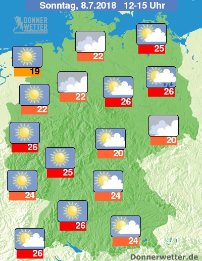 Heute Nachmittag ist es über den westlichen Landesteilen verbreitet sonnig. Im Osten ist es zum Teil heiter, teils ziehen aber auch dichte Wolken durch, dabei bilden sich jedoch nur selten Schauer, sonst ist es heiter bis wechselnd bewölkt und trocken. Die Temperatur liegt bei 19 Grad an der Nordseeküste und bis 26 Grad entland des Ober- und Mittelrheins.