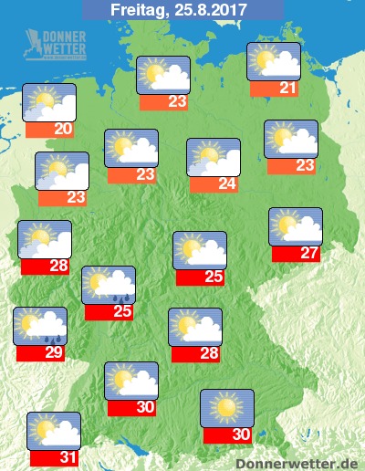 Zu Tagesbeginn halten sich regional einige dichtere Wolkenfelder. Diese sollten sich jedoch bald auflösen und der Sonne Platz machen. Dann wird es überwiegend freundlich und sommerlich im Lande. Im Laufe des Nachmittags entwickeln sich in der Mitte und im Süden einzelne Gewittergüsse. Die Temperaturen steigen im Norden auf angenehme 20 bis 25 Grad, im Süden und Westen können zwischen 25 und 31 Grad erreicht werden. Der Wind weht meist nur schwach.