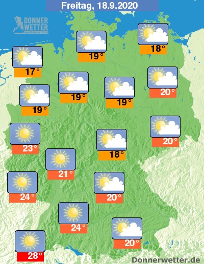 Die Höchsttemperaturen liegen allgemein zwischen 17 und 23 Grad, im Südwesten können spätsommerliche 24 bis 29 Grad erreicht werden.