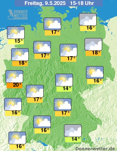Am Freitagnachmittag zeigt sich der Himmel über weiten Landesteilen heiter bis wolkig oder es ist aufgelockert bewölkt; dichtere Wolkenfelder ziehen am Nachmittag über den Nordosten hinweg, auch über dem Süden ist es gebietsweise stärker bewölkt. Es bleibt aber trocken.