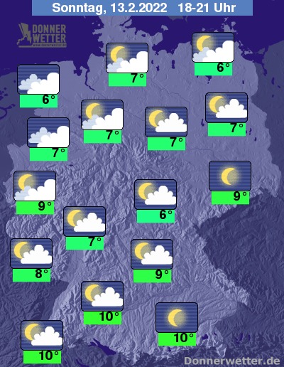Heute Abend ist der Himmel über dem Süden und Osten vielerorts nur locker bewölkt oder sogar sternenklar. Im übrigen Bundesgebiet ziehen jedoch meist viele und oft auch dichte Wolken durch. Es bleibt landesweit trocken bei 6 Grad in Jena und 10 Grad in München.