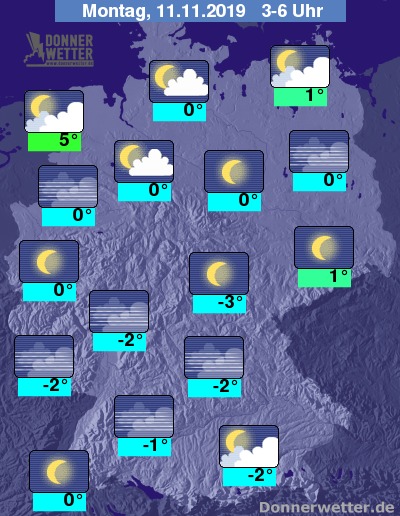 In der bevorstehenden Nacht ist es über dem Nordwesten und äußeren Norden teils stark, teils aufgelockert bewölkt, jedoch trocken. Im übrigen Bundesgebiet ist es verbreitet sternenklar. Die Temperatur sinkt auf 5 Grad in Emden und auf frostige -3 Grad im Vogtland.