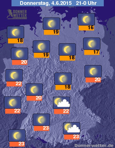 Die erste Nachthälfte zeigt sich dann verbreitet klar. Im Süden liegen die Temperaturen zum Teil noch deutlich über der 20-Grad-Marke, die niederigsten Werte werden an der Ostseeküste erreicht.