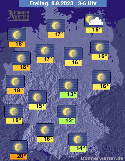 In der Nacht zum Freitag zeigt sich der Himmel über dem Land sternenklar, dazu bleibt es trocken. Die Temperaur sinkt auf tropische 20 Grad in Freiburg und etwa 13 Grad in Jena.